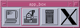 The output of the program is shown in Figure 26-1./* app_box.c -- make an array of DrawnButtons that, when activated, ** executes a program. When the program is running, the drawn button ** associated with the program is insensitive. When the program dies, ** reactivate the button so the user can select it again. */ #include <Xm/DrawnB.h> #include <Xm/RowColumn.h> #include <signal.h> #ifndef SYSV #include <sys/wait.h> #else /* SYSV */ #define SIGCHLD SIGCLD #endif /* SYSV */ #define MAIL_PROG "/bin/mail" typedef struct { Widget drawn_w; char *pixmap_file; char *exec_argv[6]; /* 6 is arbitrary, but big enough */ int pid; } ExecItem; ExecItem prog_list[] = { { NULL, "terminal", { "xterm", NULL }, 0 }, { NULL, "flagup", { "xterm", "-e", MAIL_PROG, NULL }, 0 }, { NULL, "calculator", { "xcalc", NULL }, 0 }, { NULL, "xlogo64", { "foo", NULL }, 0 } }; XtApp Context app;/* application context for the whole program */ GC gc; /* used to render pixmaps in the widgets */ void reset (int); void reset_btn (XtPointer, XtIntervalId *); void redraw_button (Widget, XtPointer, XtPointer); void exec_prog (Widget, XtPointer, XtPointer); main (int argc, char *argv[]) { Widget toplevel, rowcol; Pixmap pixmap; Pixel fg, bg; Arg args[8]; int i, n; /* we want to be notified when child programs die */ (void) signal (SIGCHLD, reset); XtSetLanguageProc (NULL, NULL, NULL); /* Since this is an X11R5 example... ** For X11R6, use XtVaOpenApplication() */ toplevel = XtVaAppInitialize (&app, "Demos", NULL, 0, &argc, argv, NULL, NULL); n = 0; XtSetArg (args[n], XmNorientation, XmHORIZONTAL); n++; rowcol = XmCreateRowColumn (toplevel, "rowcol", args, n); /* get the foreground and background colors of the rowcol ** so the gc (DrawnButtons) will use them to render pixmaps. */ XtVaGetValues (rowcol, XmNforeground, &fg, XmNbackground, &bg, NULL); gc = XCreateGC (XtDisplay (rowcol), RootWindowOfScreen (XtScreen (rowcol)), NULL, 0); XSetForeground (XtDisplay (rowcol), gc, fg); XSetBackground (XtDisplay (rowcol), gc, bg); for (i = 0; i < XtNumber (prog_list); i++) { /* the pixmap is taken from the name given in the structure */ pixmap = XmGetPixmap (XtScreen (rowcol), prog_list[i].pixmap_file, fg, bg); /* Create a drawn button 64x64 (arbitrary, but sufficient) ** shadowType has no effect till pushButtonEnabled is false. */ n = 0; XtSetArg (args[n], XmNwidth, 64); n++; XtSetArg (args[n], XmNheight, 64); n++; XtSetArg (args[n], XmNpushButtonEnabled, True); n++; XtSetArg (args[n], XmNshadowType, XmSHADOW_ETCHED_OUT); n++; prog_list[i].drawn_w = XmCreateDrawnButton (rowcol, "dbutton", args, n); XtManageChild (prog_list[i].drawn_w); /* if this button is selected, execute the program */ XtAddCallback (prog_list[i].drawn_w, XmNactivateCallback, exec_prog, (XtPointer) &prog_list[i]); /* when the resize and expose events come, redraw pixmap */ XtAddCallback (prog_list[i].drawn_w, XmNexposeCallback, redraw_button, (XtPointer) pixmap); XtAddCallback (prog_list[i].drawn_w, XmNresizeCallback, redraw_button, (XtPointer) pixmap); } XtManageChild (rowcol); XtRealizeWidget (toplevel); XtAppMainLoop (app); } /* redraw_button() -- draws the pixmap into its DrawnButton ** using the global GC. Get the width and height of the pixmap ** being used so we can either center it in the button or clip it. */ void redraw_button (Widget button, XtPointer client_data, XtPointer call_data) { Pixmap pixmap = (Pixmap) client_data; int unused, destx, desty; unsigned int srcx, srcy, pix_w, pix_h; int drawsize, border; Dimension bdr_w, w_width, w_height; short hlthick, shthick; Window root; XmDrawnButtonCallbackStruct *cbs = (XmDrawnButtonCallbackStruct *) call_data; /* get width and height of the pixmap. don't use srcx and root */ XGetGeometry (XtDisplay (button), pixmap, &root, &unused, &unused, &pix_w, &pix_h, &srcx, &srcx); /* get the values of all the resources that affect the entire ** geometry of the button. */ XtVaGetValues (button, XmNwidth, &w_width, XmNheight, &w_height, XmNborderWidth, &bdr_w, XmNhighlightThickness, &hlthick, XmNshadowThickness, &shthick, NULL); /* calculate available drawing area, width first */ border = bdr_w + hlthick + shthick; /* if window is bigger than pixmap, center it; else clip pixmap */ drawsize = w_width - 2 * border; if (drawsize > pix_w) { srcx = 0; destx = (drawsize - pix_w) / 2 + border; } else { srcx = (pix_w - drawsize) / 2; pix_w = drawsize; destx = border; } drawsize = w_height - 2 * border; if (drawsize > pix_h) { srcy = 0; desty = (drawsize - pix_h) / 2 + border; } else { srcy = (pix_h - drawsize) / 2; pix_h = drawsize; desty = border; } XCopyArea (XtDisplay (button), pixmap, cbs->window, gc, srcx, srcy, pix_w, pix_h, destx, desty); } /* exec_proc() -- the button has been pressed; fork() and call ** execvp() to start up the program. If the fork or the execvp ** fails (program not found?), the sigchld catcher will get it ** and clean up. If the program is successful, set the button's ** sensitivity to False (to prevent the user from exec'ing again) ** and set pushButtonEnabled to False to allow shadowType to work. */ void exec_prog (Widget drawn_w, XtPointer client_data, XtPointer call_data) { ExecItem *program = (ExecItem *) client_data; XmDrawnButtonCallbackStruct *cbs = (XmDrawnButtonCallbackStruct *) call_data; switch (program->pid = fork ()) { case 0: /* child */ execvp (program->exec_argv[0], program->exec_argv); perror (program->exec_argv[0]); /* command not found? */ _exit (255); case -1: printf ("fork() failed.\n"); } /* The child is off executing program... parent continues */ if (program->pid > 0) { XtVaSetValues (drawn_w, XmNpushButtonEnabled, False, NULL); XtSetSensitive (drawn_w, False); } } /* reset() -- a program died, so find out which one it was and ** reset its corresponding DrawnButton widget so it can be reselected */ void reset (int unused) { int pid, i; #ifdef SYSV int status; #else /* SYSV */ union wait status; #endif /* SYSV */ if ((pid = wait (&status)) != -1) { for (i = 0; i < XtNumber (prog_